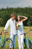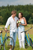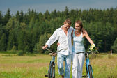 romantyczna para młoda z stary rower w przyrodzie wiosną na słoneczny dzień