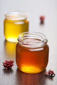 o strukturze plastra miodu i miód w słoiku na drewniane tła