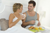 luksusowe miesiąc miodowy śniadania - para w białym łóżku razem