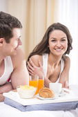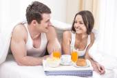 luksusowe miesiąc miodowy śniadania - para w białym łóżku razem