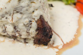 soczysty kawałek mięsa z sosem śmietankowym zbliżenie na czarnej płycie