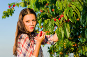 jesień kraju - kobieta z wiklinowym koszu zbioru jabłko
