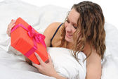 sypialnia niespodzianka obecny - młoda kobieta szczęśliwa w sypialni
