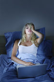 sypialnia wieczorem - kobieta z laptopa, leżącej w łóżku