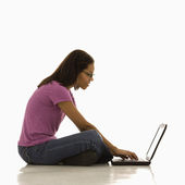uśmiechający się nastolatek siedzi z laptopa i pisanie notatek na parkiet