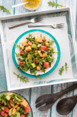 Zdjęcie "Duża miska serwująca wypełniona śródziemnomorską sałatką i małe danie płatków chili z przodu." może być wykorzystywane do celów osobistych i komercyjnych zgodnie z warunkami zakupionej licencji Royalty-free. Obraz jest dostępny do pobrania w jakości wysokiej rozdzielczości do 5760x3840.