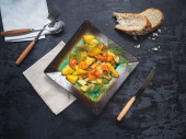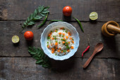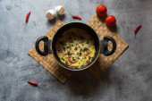 Zdjęcie "Indyjskie przekąski aloo jeera lub gotowane ziemniaki zmieszane z pieprzem i posiekaną cebulą. Widok z góry." może być wykorzystywane do celów osobistych i komercyjnych zgodnie z warunkami zakupionej licencji Royalty-free. Obraz jest dostępny do pobrania w jakości wysokiej rozdzielczości do 5760x3840.