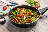 Patelnia ze smaczną wołowiną i warzywami na grunge tle