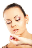 pielęgnacji skóry makijaż - kobieta stosuje perła proszek z pędzla