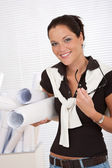 Zdjęcie "młody uśmiechający się kobiece architekt z planów" może być wykorzystywane do celów osobistych i komercyjnych zgodnie z warunkami zakupionej licencji Royalty-free. Obraz jest dostępny do pobrania w jakości wysokiej rozdzielczości do 5760x3840.