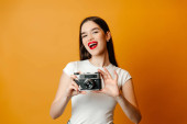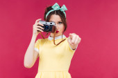 Szczęśliwa młoda kobieta z długimi czerwonymi włosami w swetrze i berecie stojącym nad żółtą ścianą tła, trzymając aparat fotograficzny
