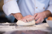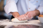 Samiec kucharz piekarz w białej koszuli i szary fartuch ugniatający ciasto na ciemnym stole kuchennym