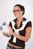 młody atrakcyjny architekt kobiet posiadających plany i telefon w urzędzie