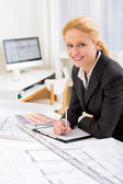 uśmiechnięta kobieta architekt z planami w urzędzie