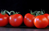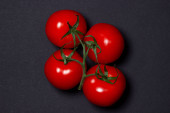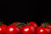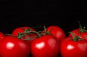 Pomidory na czarnym tle. Pomidory na winorośli na ciemnym tle. Świeże warzywa.