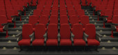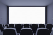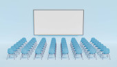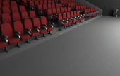 zbliżenie mikrofonu w teatrze z rozmytymi fotelami w tle. miejsce na tekst. 3d renderowanie