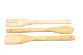 Drewniana łyżka, widelec i łopatka naczynia kuchenne do gotowania żywności na izolowanym białym tle