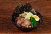 Japońska zupa miso ramen na ciemnym tle. Makaron japoński.