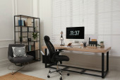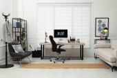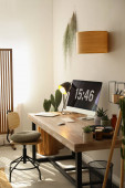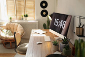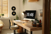 Zdjęcie "Wnętrze pokoju z wygodnym miejscem pracy. Nowoczesny komputer na drewnianym biurku" może być wykorzystywane do celów osobistych i komercyjnych zgodnie z warunkami zakupionej licencji Royalty-free. Obraz jest dostępny do pobrania w jakości wysokiej rozdzielczości do 5760x3840.