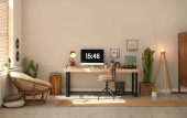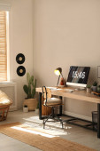 Wnętrze pokoju z wygodnym miejscem pracy. Nowoczesny komputer na drewnianym biurku