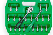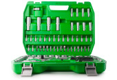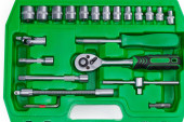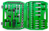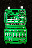 Otwarta zielona skrzynia z zestawem narzędzi do naprawy samochodów, widok z góry. Izolacja na białym tle.