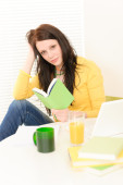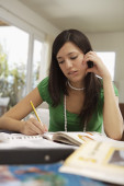 dziewczynka nastolatek - uczeń napisać pracę domową, siedzi przy stole