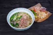 Zupa z piersi kurczaka, makaron ryżowy, zielona cebula, kukurydza, mango
