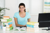 nastolatka dziewczyny relaks w domu - czytać książki, siadając przy stole