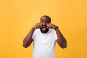 jeden afrykański młody człowiek pozowanie izolowane nad żółtym tle studio z copyspace dla reklamy