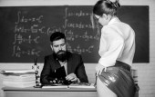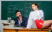 Flirtuję z kolegą. Wszyscy marzą o takim nauczycielu. Atrakcyjna nauczycielka w skórzanej spódnicy. Bezczelny nauczyciel. Bezczelny student. Nauka jest seksowna. sexy dziewczyna siedzieć stół a mężczyzna stać tablicy