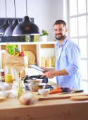 Człowiek po przepis na cyfrową tabletkę i gotowanie smaczne i zdrowe jedzenie w kuchni w domu