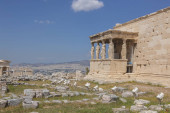 Starożytna świątynia Erechtheion z pięknymi Karyatidami na wzgórzu Akropolu, słynna atrakcja turystyczna w Atenach, Grecja, w słoneczny letni dzień