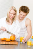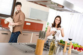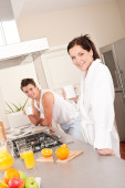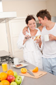 uśmiechający się filiżankę kawy na śniadanie w kuchni