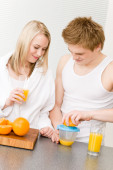 kobieta o kawa na śniadanie, w kuchni, człowiek czytanie gazety w tle