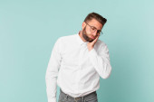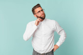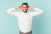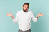 młody przystojny mężczyzna wzrusza ramionami, czuje się zdezorientowany i niepewny