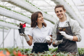 Świetna robota. Uśmiechnięci ogrodnicy dobrze się bawią po posadzeniu kwiatów w szklarni