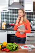 piękna kobieta gospodarstwa książki kucharskiej i myślenia