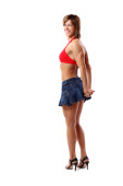 Zdjęcie "piękne Młoda kobieta w wysokich obcasach i piękny czerwony Ubierz stojąc na krześle w studio z długie brązowe włosy i jedną nogą. na białym tle." może być wykorzystywane do celów osobistych i komercyjnych zgodnie z warunkami zakupionej licencji Royalty-free. Obraz jest dostępny do pobrania w jakości wysokiej rozdzielczości do 5760x3840.