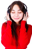 portret szczęśliwy kobieta korzystających muzyki ze słuchawkami sobie golfem na białym tle