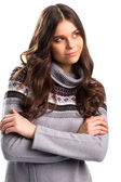 portret piękne Młoda kobieta ubrana golfem na białym tle