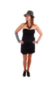 piękne Młoda kobieta w wysokich obcasach i piękne kolorowe sukienka, siedząc na krześle w studio z długie brązowe włosy. na białym tle.