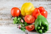 Asortyment świeżych surowych warzyw w drewnianym pudełku na stole domowej kuchni. Zdrowa żywność, koncepcja diety warzywnej.