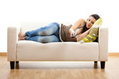 Studenci - szczęśliwa kobieta nastolatek z chipsy w nowoczesnym salonie