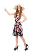piękna młoda kobieta w niebieski i zielony strój i perła łańcucha z duży czarny kapelusz słomkowy, uśmiechając się i patrząc w kamerę, biały.