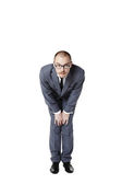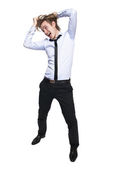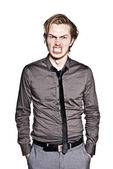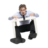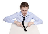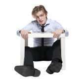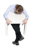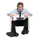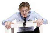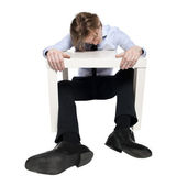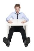 młody biznesmen, pracownik biurowy lub student siedząc w zabawny stolik. Studio fotografii, na białym tle.