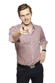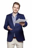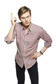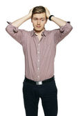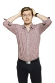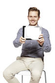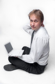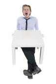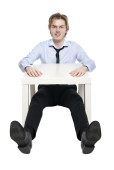 młody biznesmen, pracownik biurowy lub student siedząc w zabawny stolik. Studio fotografii, na białym tle.