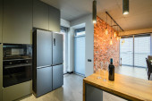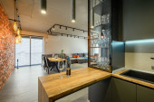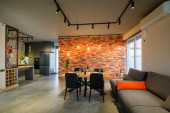 Zdjęcie "Nowoczesny duży luksusowy apartament typu studio ze stołem jadalnym" może być wykorzystywane do celów osobistych i komercyjnych zgodnie z warunkami zakupionej licencji Royalty-free. Obraz jest dostępny do pobrania w jakości wysokiej rozdzielczości do 5760x3840.