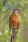 Niski kąt zbliżenie wizerunek wschodni Robin podgatunek amerykański Robin (Turdus migratorius) siedzący na gałęzi drzewa trzymając dżdżownicę w jego dziób.