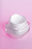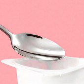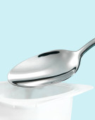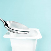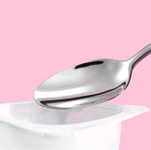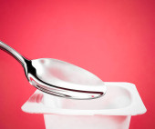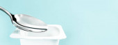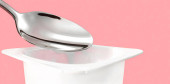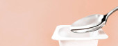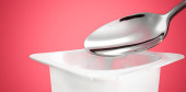 Kubek jogurtowy i srebrna łyżka na różowym tle, biały plastikowy pojemnik z kremem jogurtowym, świeży nabiał dla zdrowej diety i równowagi żywieniowej