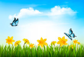 Piękne kwitnące żółte żonkile na zewnątrz w słoneczny dzień. Miejsce na tekst